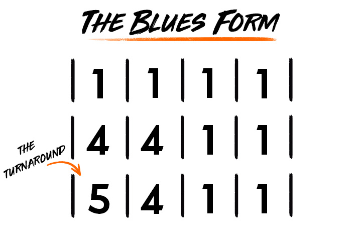 You now have your key – your musical home – and your Blues Survival Shapes. And, if you valiantly detoured through the theory section above, you know why the chords are called 1, 4, and 5. The only thing left is to make sure we know when to play the 1, the 4 and the 5.