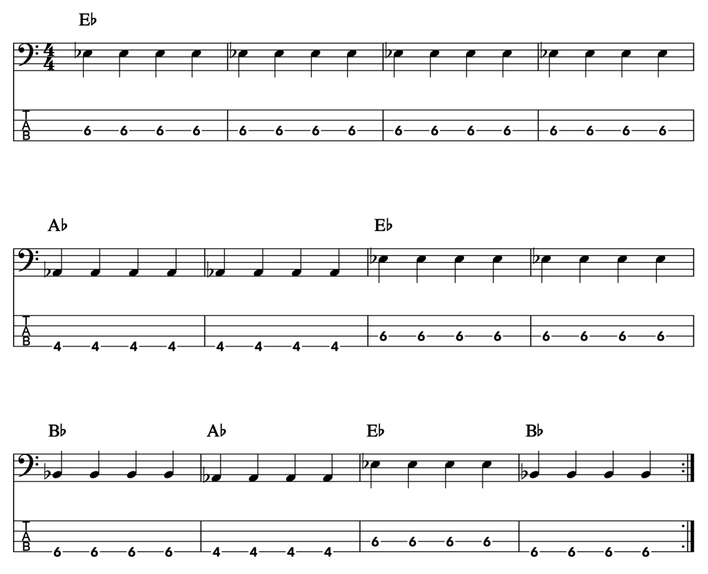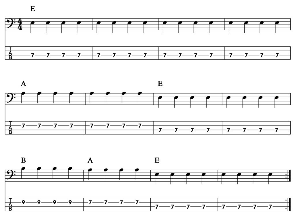 For our example, a 12 bar blues in the key of E, you’ll need to find an E on your bass.