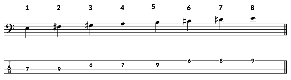 As you can see in the major scale fingering chart, there are 7 different notes in the major scale. (The eighth note is the same as the first, called the octave.) If we begin numbering them in order, 1 for our first note E, and so on and so forth, we get this: