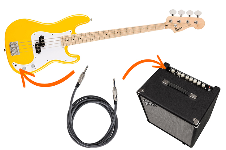 And so – step 1. Before you worry about making sound, how to position your hands, etc., you need to plug in your bass to an amp with a cable.