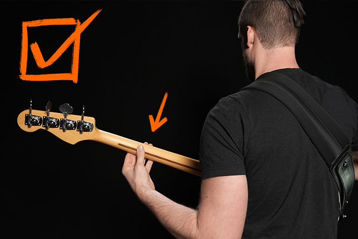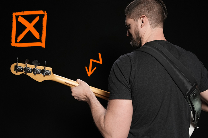Push the headstock away from your body slightly to get better access to the neck. The headstock is the part of the bass that anchors the strings and has the tuning pegs. You’ll want to create an angle with your chest of about 30-40 degrees rather than flat against your chest.