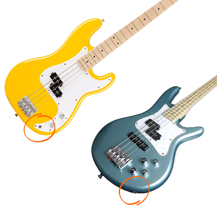 Find the jack (place where the cable plugs in) on the body of the bass. It may be on the top (where all the knobs and strings are) or it may be on the side (where the strap button is).