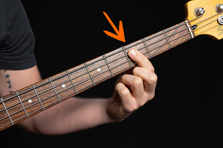 Also, you aren’t pressing the string against the wood of the bass fingerboard. You only need to create a clean, solid contact with the string against that fret wire. That’s why the space directly behind the fret you want to play is the best location for a clean, clear bass note.