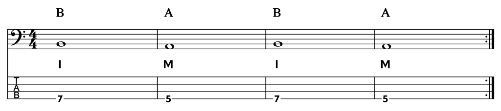 Just pluck on that 7th fret note once for 4 counts, then lift the pinky and play the 5th fret note once for 4 counts. In this exercise you’re going to go back and forth between those two notes and only those 2 notes.